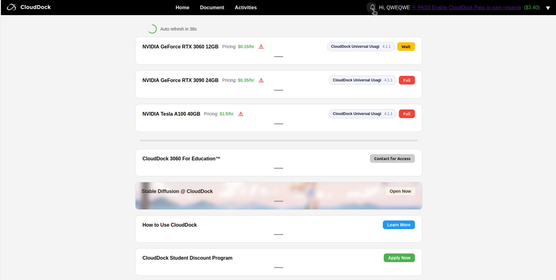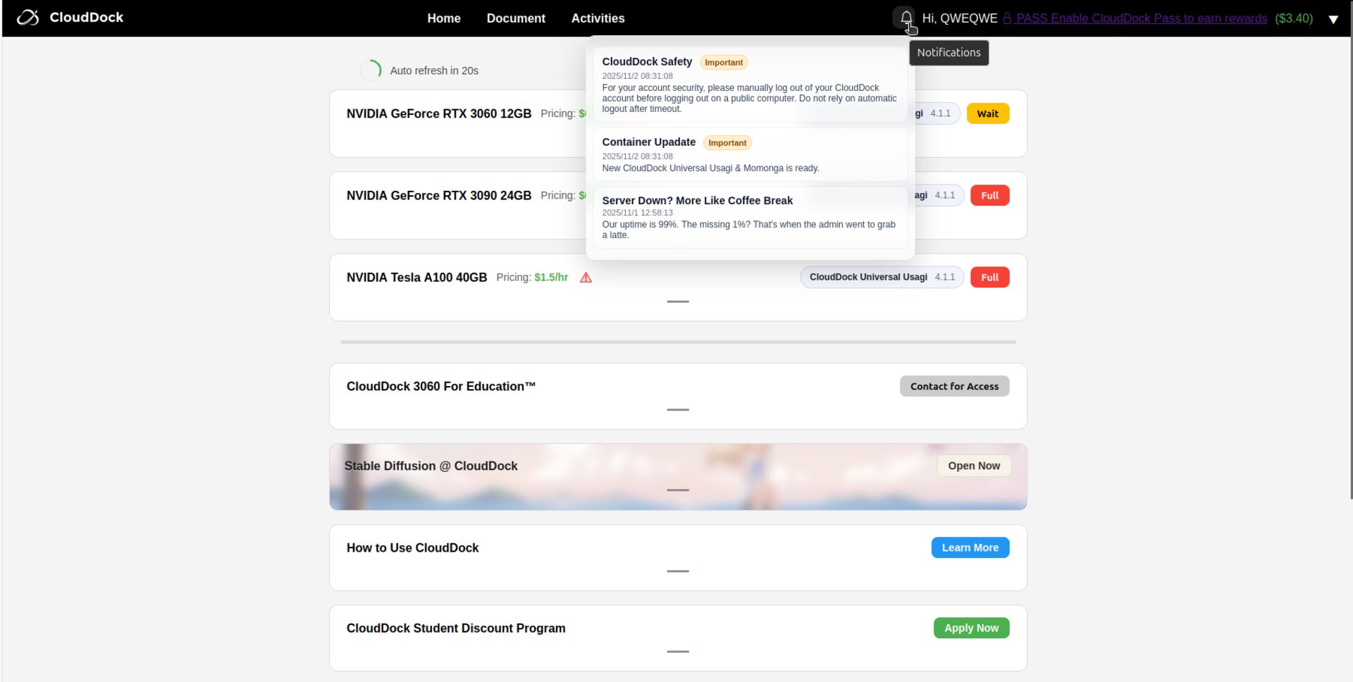 While on any CloudDock page, look at the top-right corner of the header. A small bell icon 🔔 appears next to your username and balance.