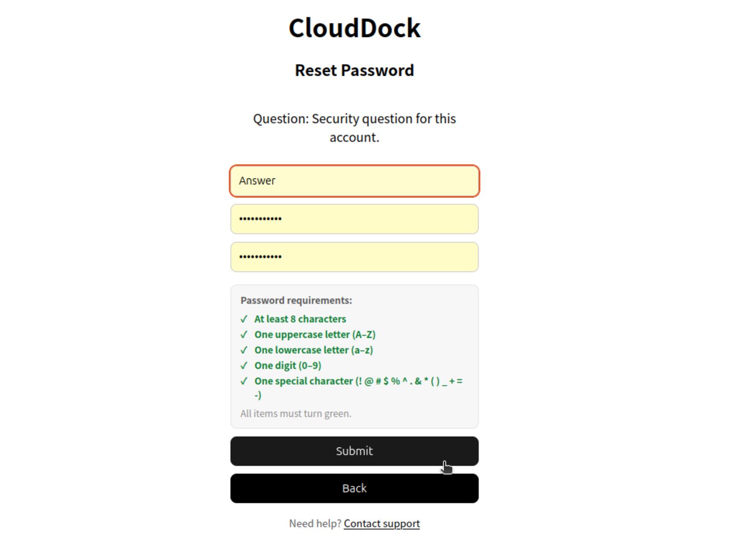 Enter the answer to your account's security question and fill in a new password, then click "Submit"