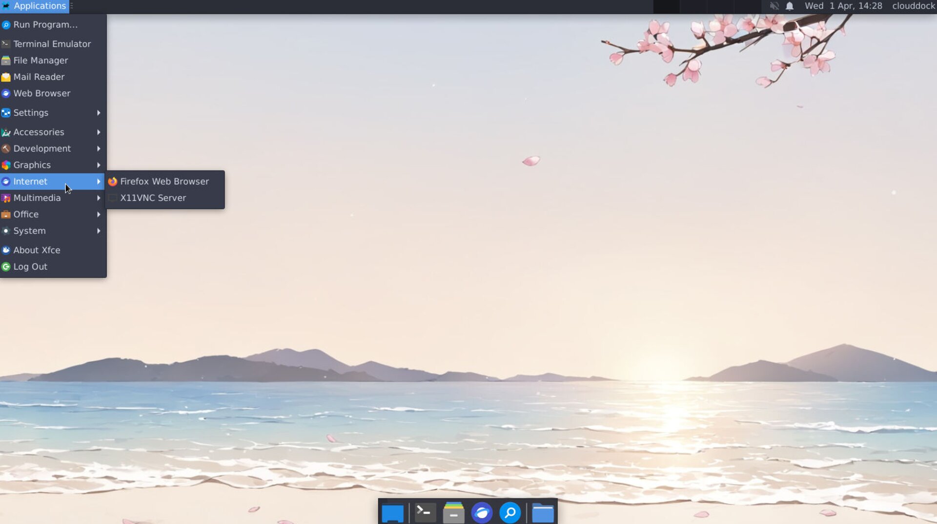 You can also launch the browser from the Application menu: click the Application menu in the top-left corner, hover over Internet.