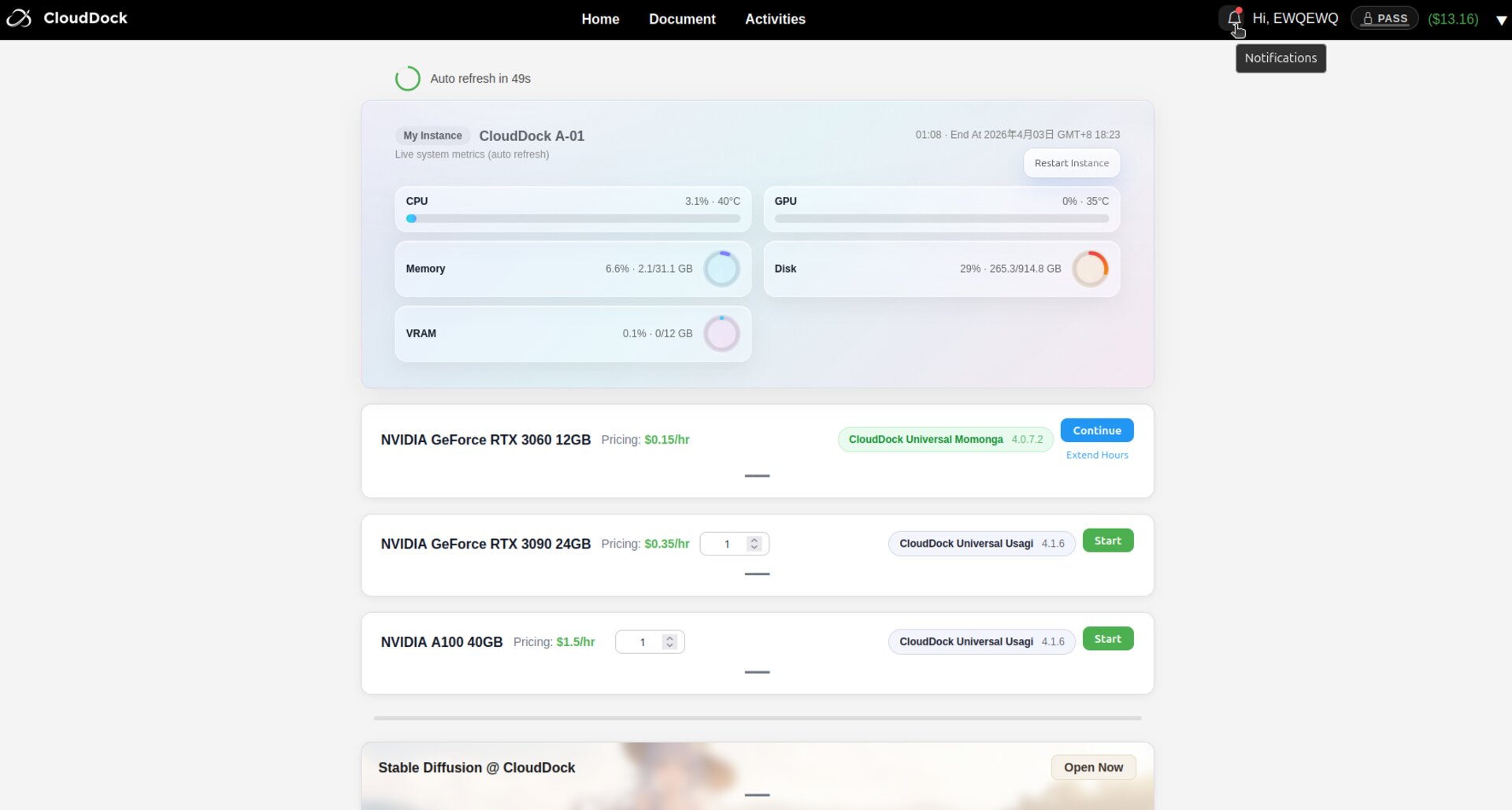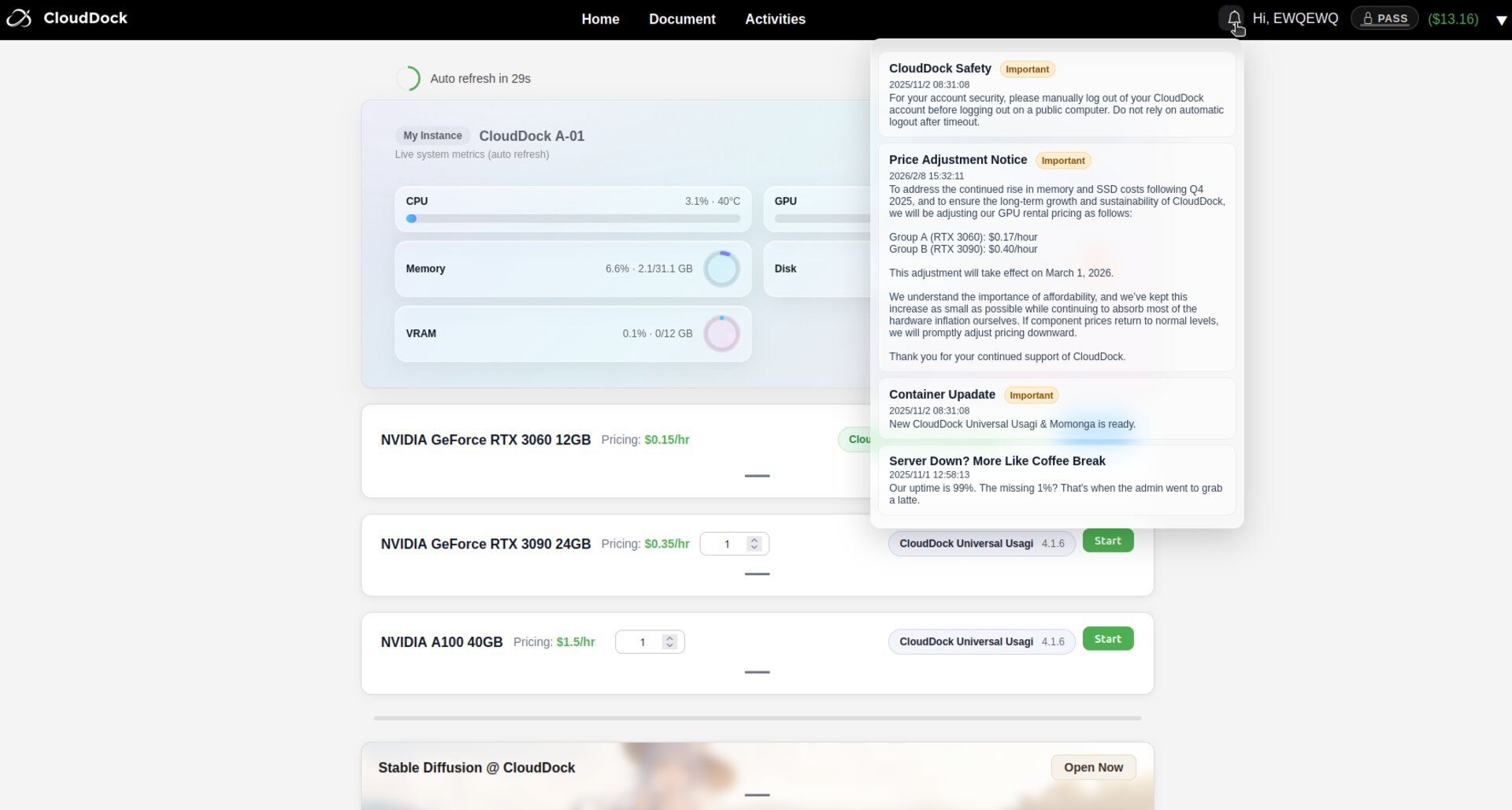 While on any CloudDock page, look at the top-right corner of the header. A small bell icon 🔔 appears next to your username and balance.