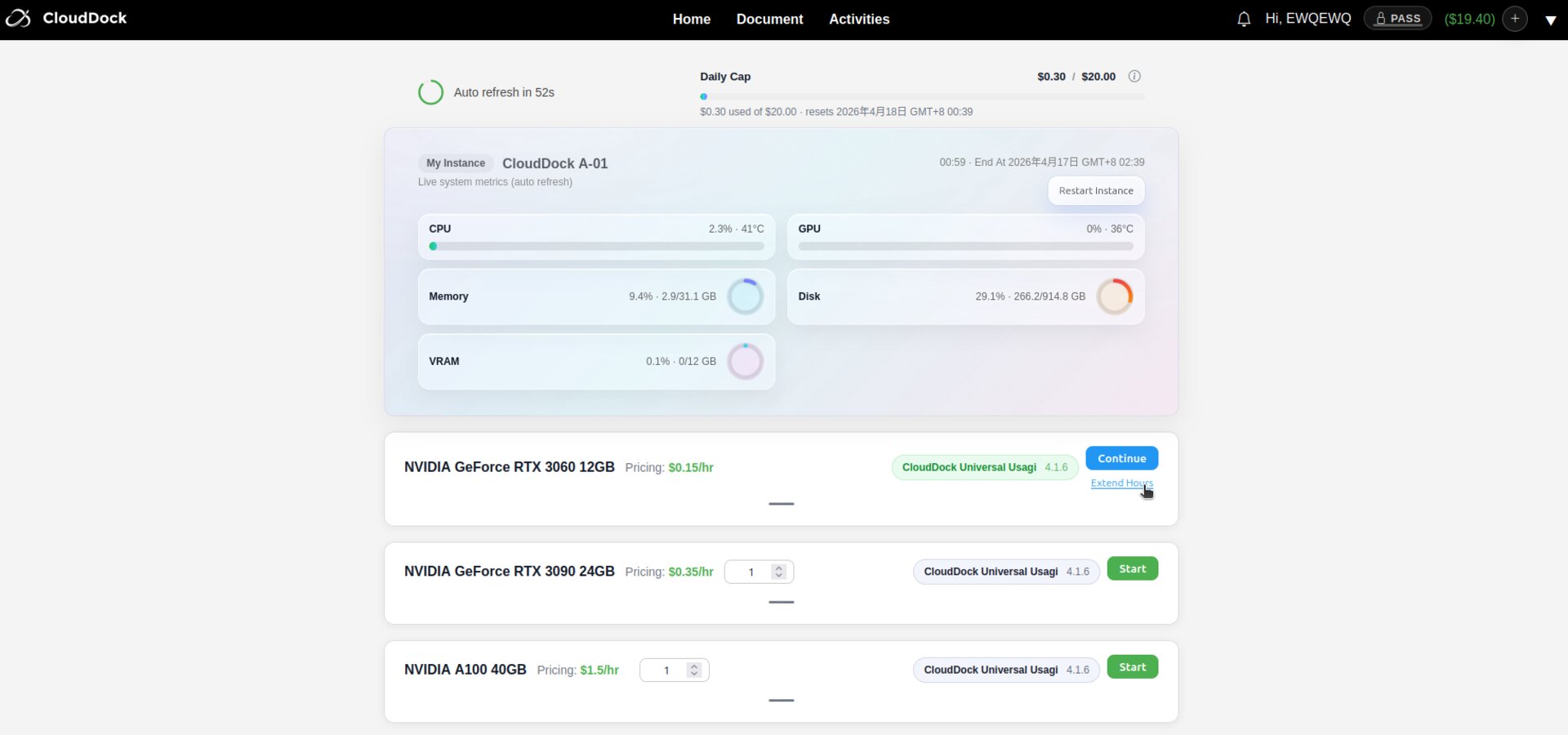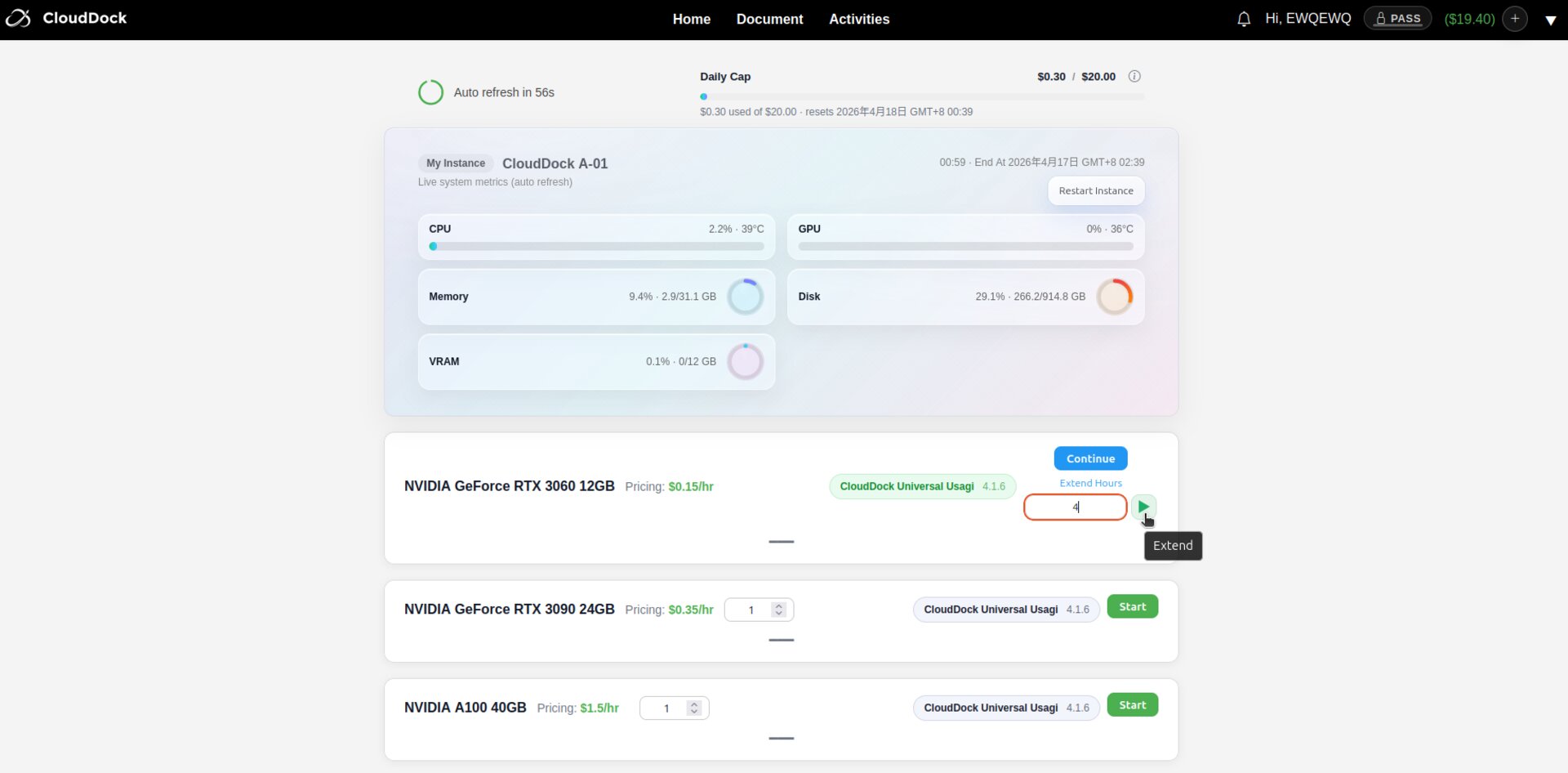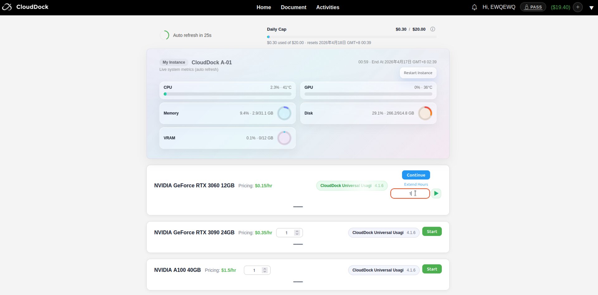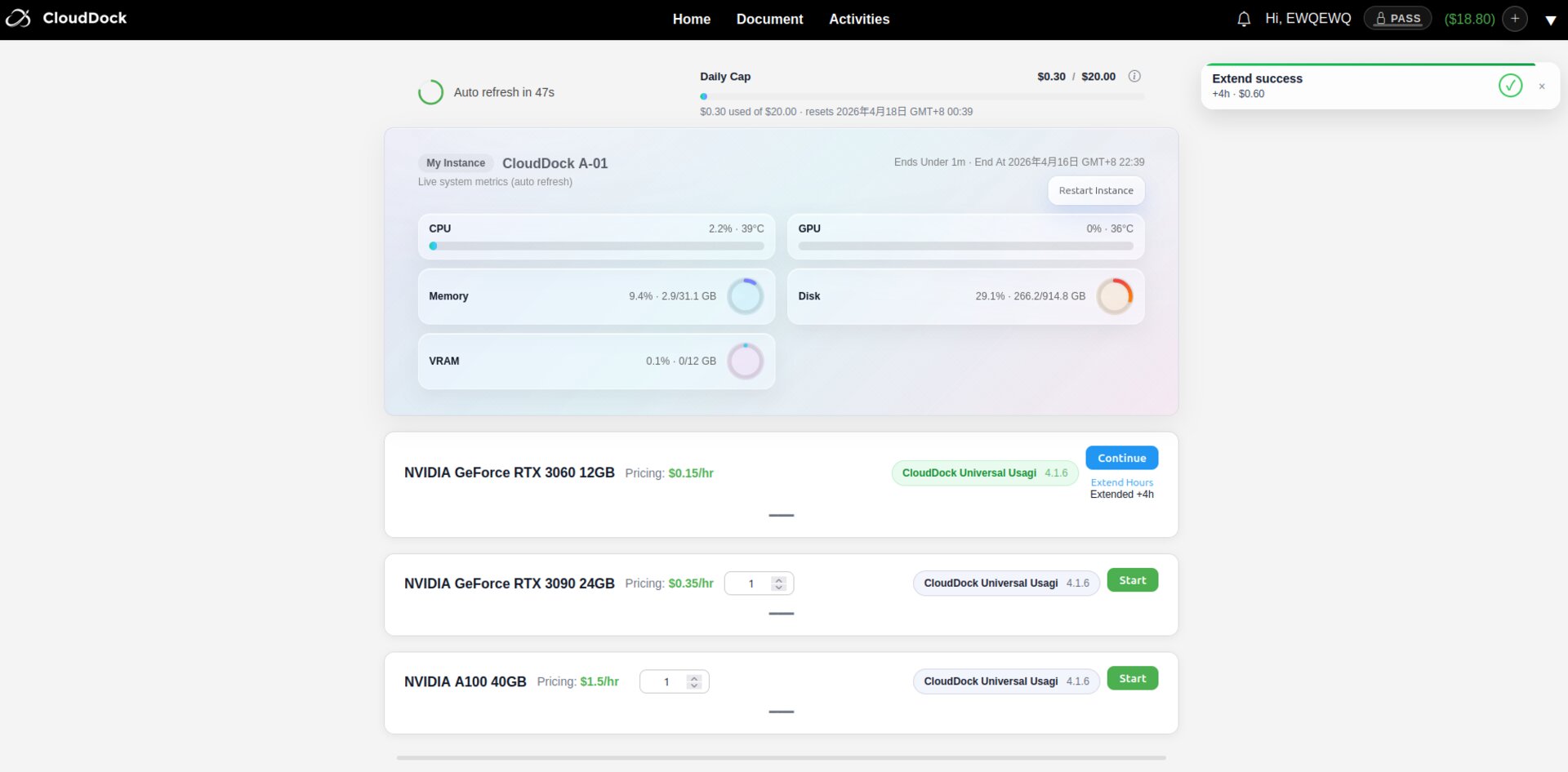 After selecting the desired duration, click “Arrow”. The fee will be deducted from your CloudDock balance immediately and your session timer will update automatically.