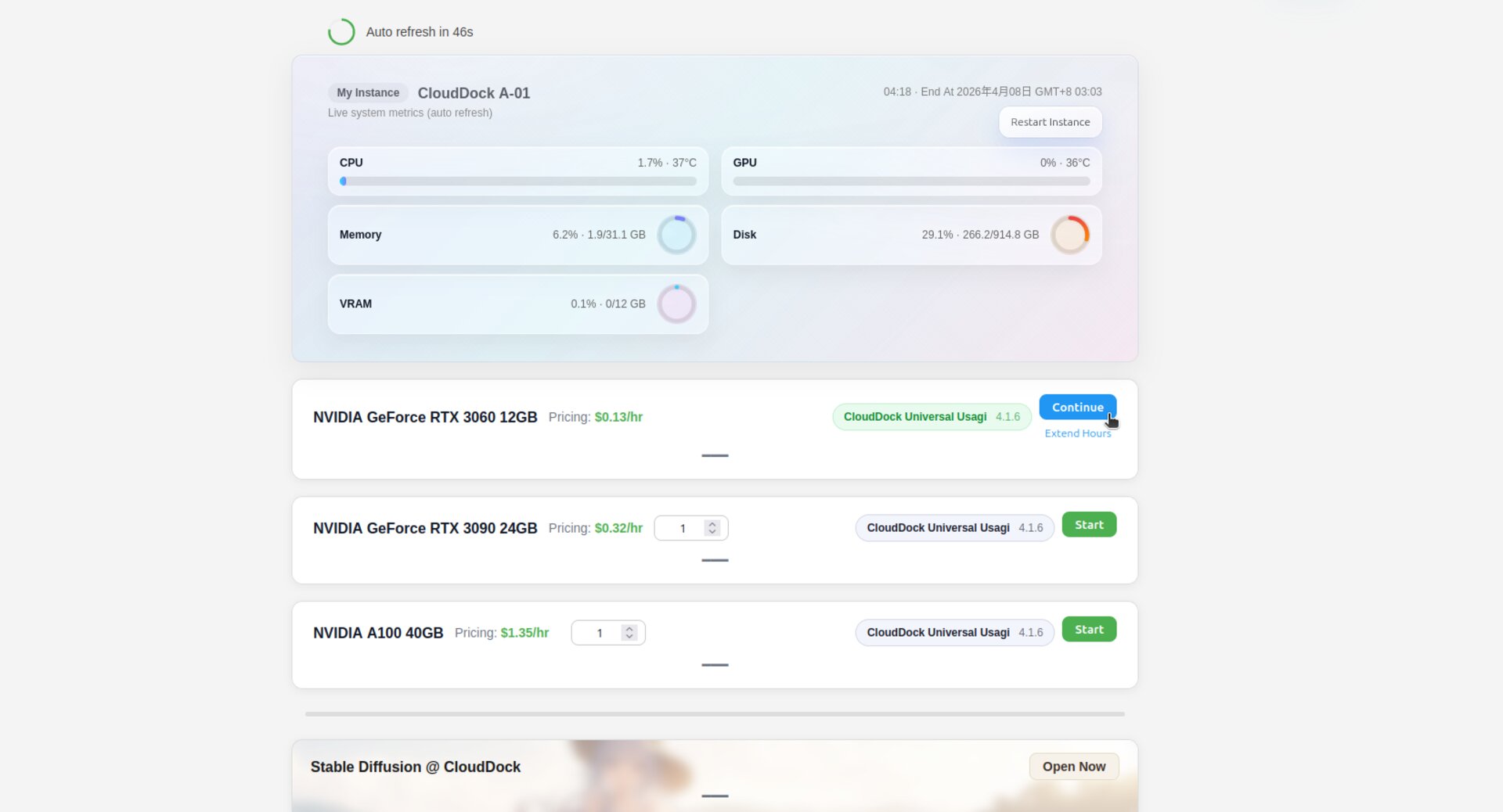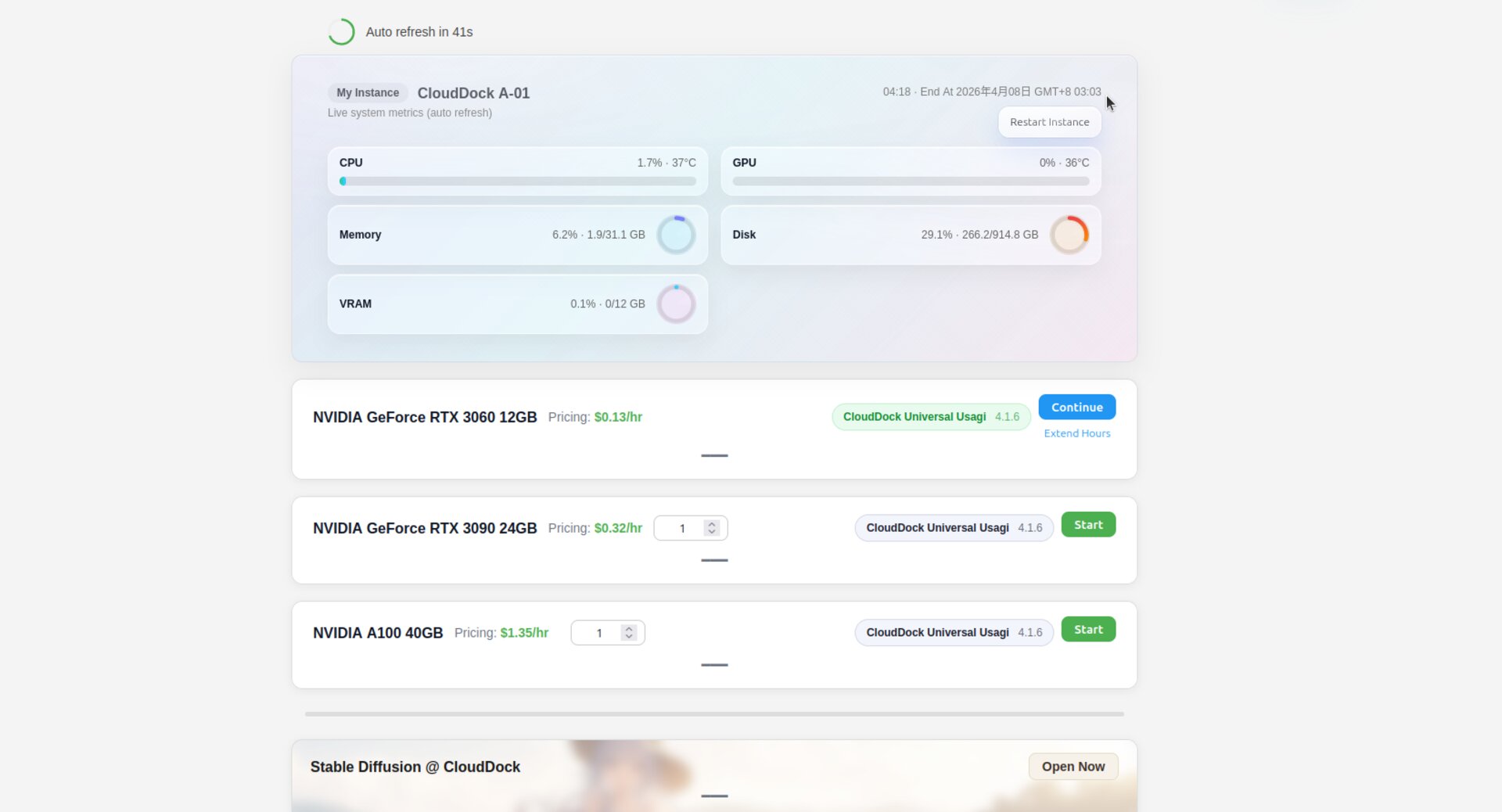 The area above the Restart Instance button displays remaining session time and the exact auto-shut-down time.