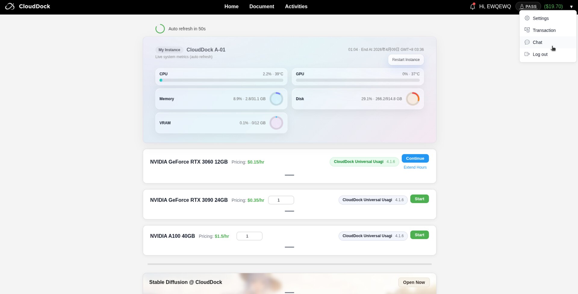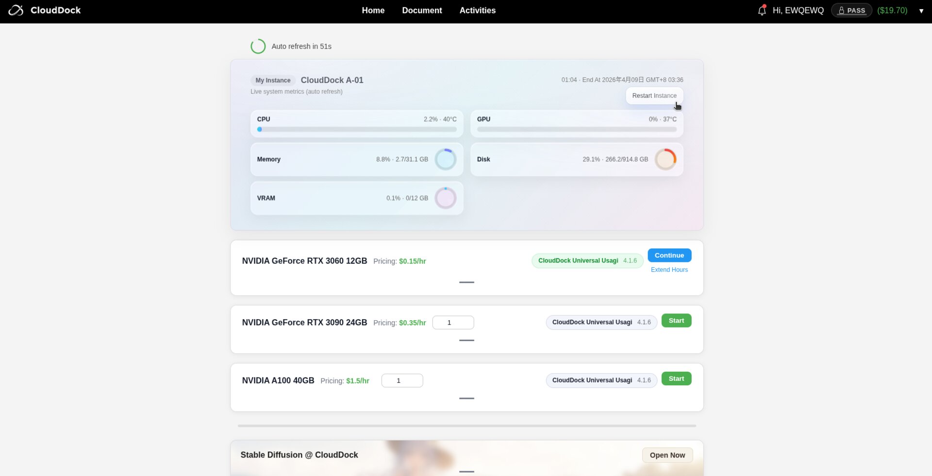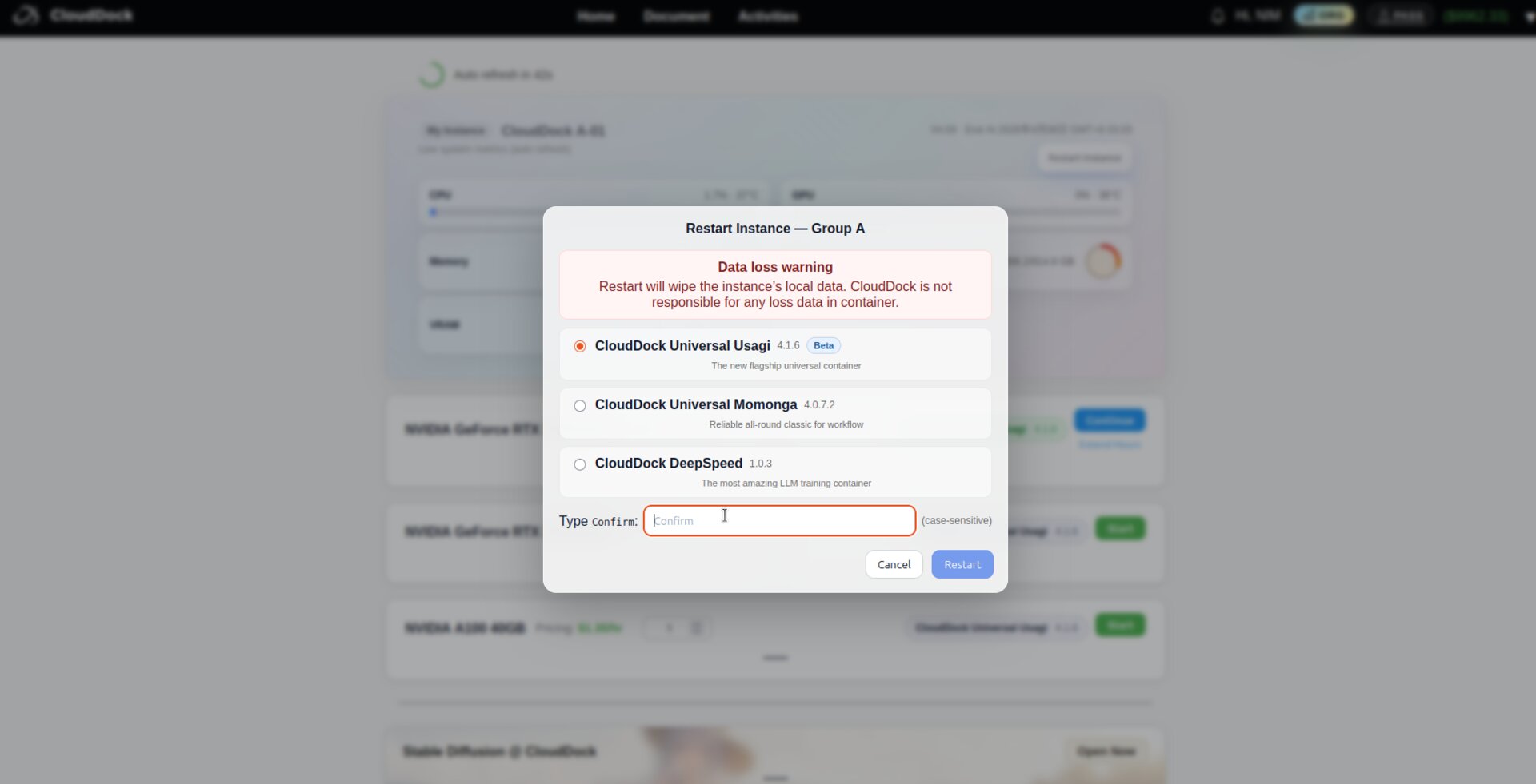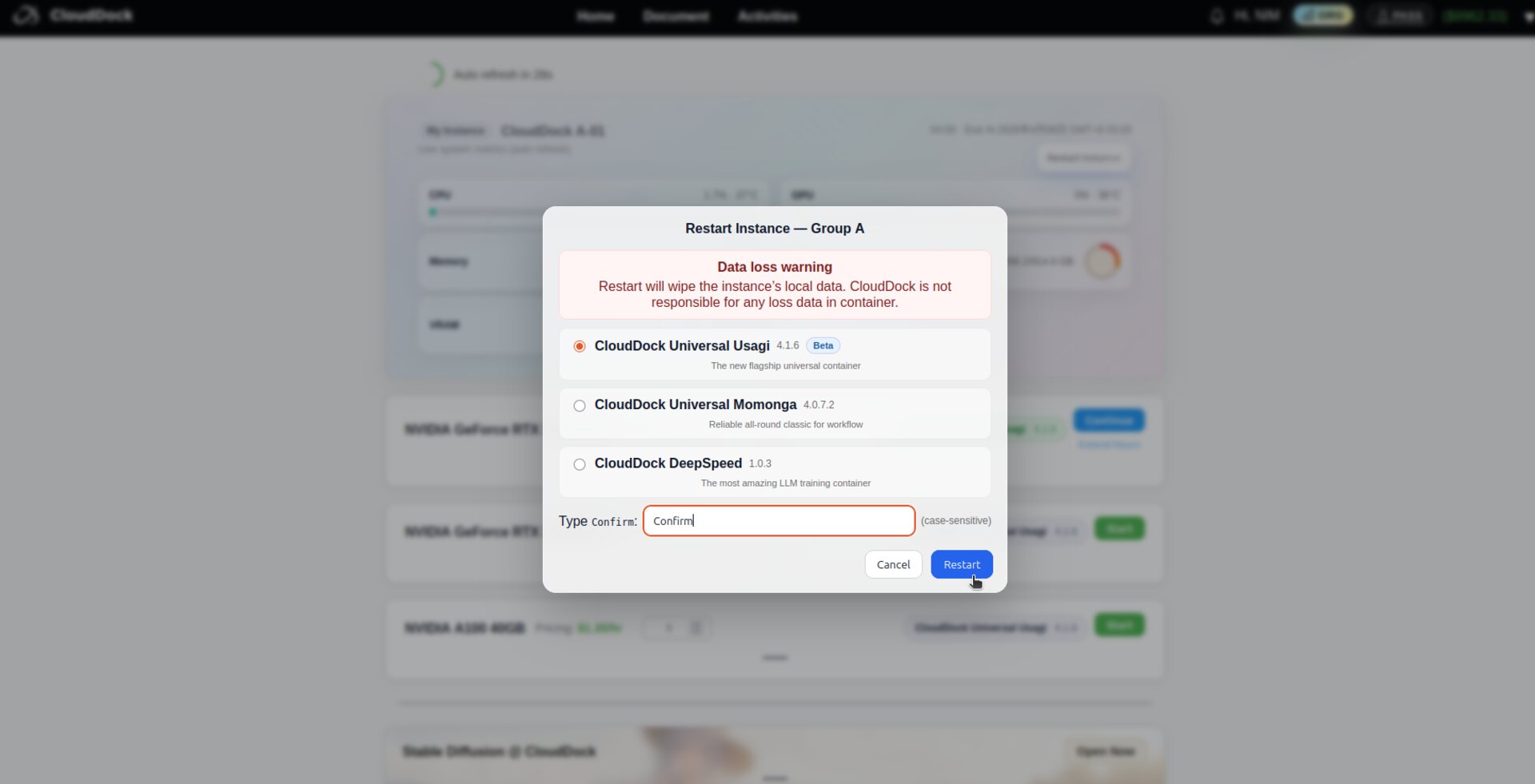 If the interface becomes unresponsive, open the Dashboard and click “Restart Instance” to reboot the container on your own.