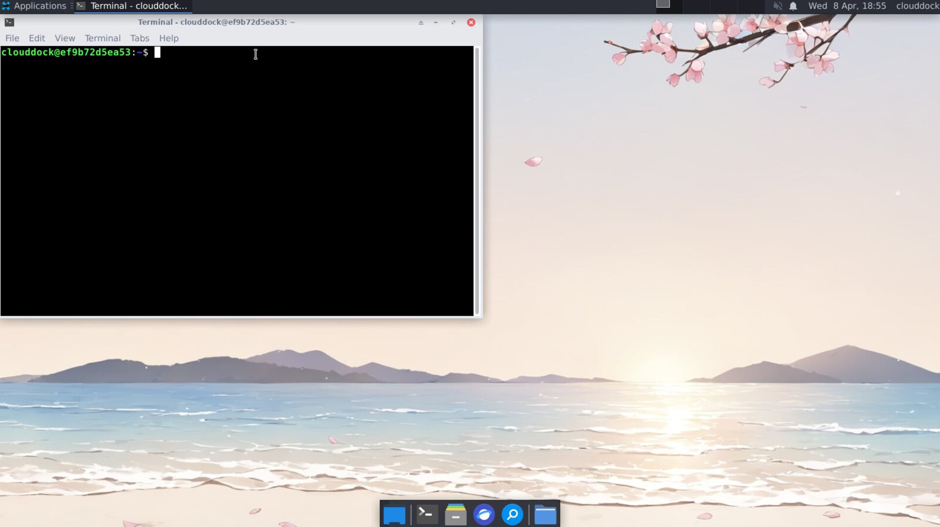 Inside the CloudDock desktop, open the Launcher menu (grid icon) and click Terminal Emulator.
