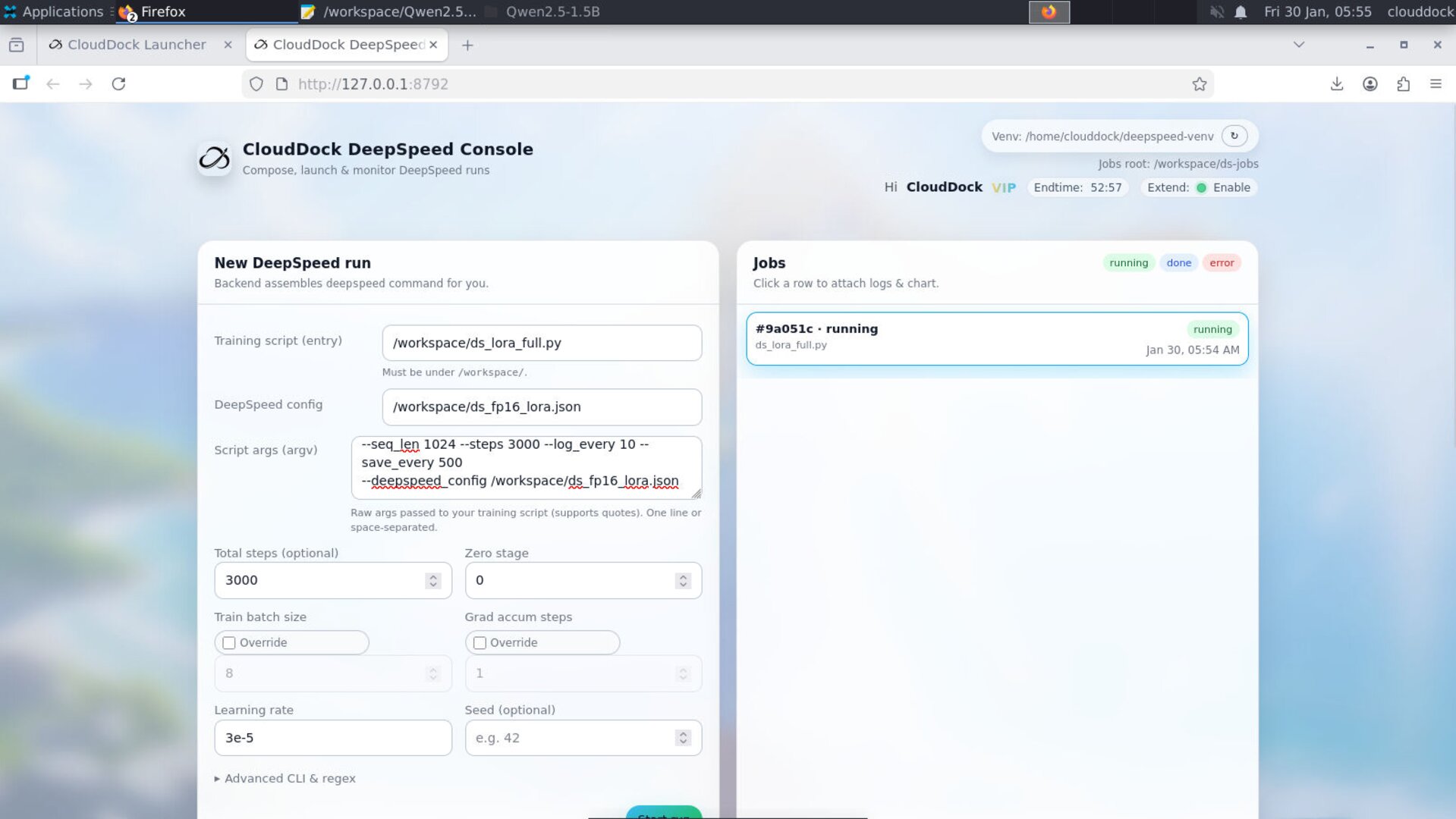 GUI is the fastest “blank instance → first run” path. In 1.0.2, you can dynamically pass args at launch, and you get real-time progress / VRAM / speed indicators plus small error hints when things fail.
